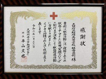 大阪府赤十字血液センターから感謝状をいただきました!