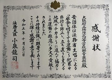 昨年、”社会を明るくする運動”のイメージソング「ワタシイロパレット」を制作したことで、10/31に開催された大阪更生保護大会にて法務大臣感謝状を頂きました。