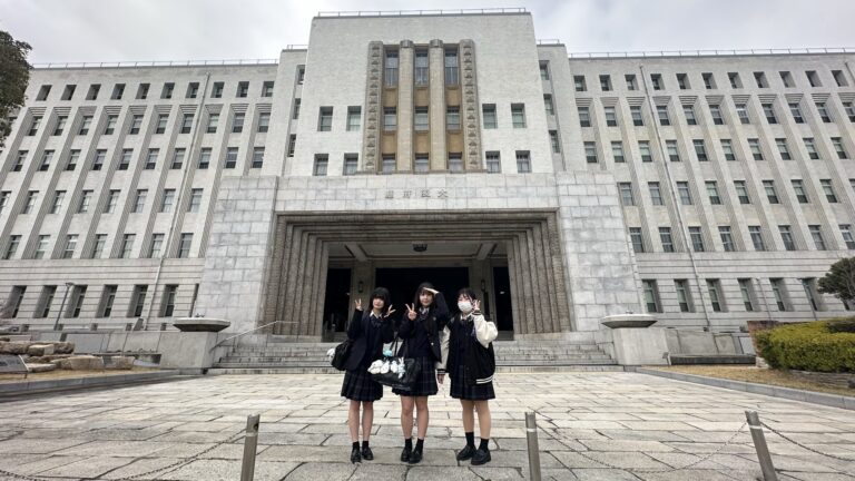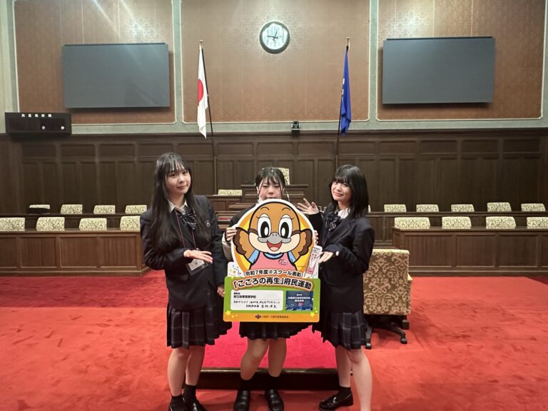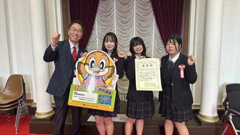 「ミャクミャクのうた」の幼稚園や小学校にまで広がる取り組みが評価され、この度、「こころの再生」府民運動@スクール表彰を受けました。本日、大阪府庁で行われた表彰式に部員3人が出席し、水野教育長より表彰状を授与していただきました。