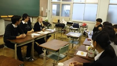 11月8日の放課後、シャーロット(フランス)、イーサン(アメリカ)、ノア(アメリカ)の3人の留学生を囲んでの交流会を実施しました。それぞれの国の生活文化や学校生活の違い、日本に来て驚いた事などを3人はすっかり上達した日…