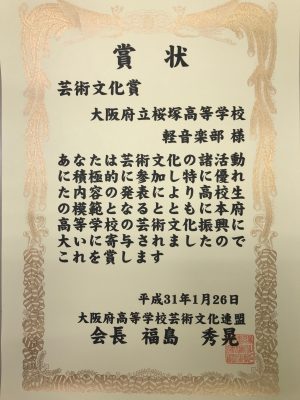大阪府高等学校芸術文化連盟の軽音楽部門において軽音楽部が平成30年度の芸術文化賞を受賞しました。本校軽音楽部の芸術文化賞受賞は3年前の平成27年度に引き続き、今回で2回目となります。今回は夏の全国高等学校総合文化祭での…