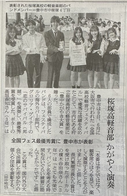 7月23日(火)産経新聞朝刊に、本校軽音楽部【全国軽音フェスティバルで最優秀賞・桜塚高軽に「豊中かがやき大賞」】の記事が掲載されました。