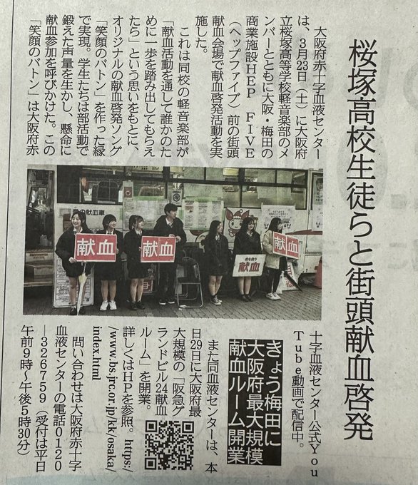3月29日(金)産経新聞夕刊に、本校軽音楽部「街頭献血啓発」の記事が掲載されました。献血啓発」の記事が掲載されました。