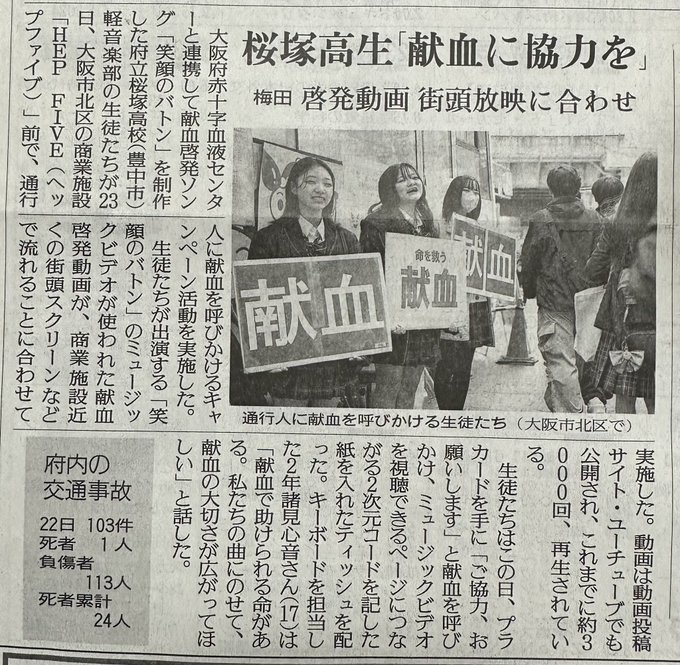 今日、梅田のHEP前にて献血の呼び掛けやティッシュ配りを、献血啓発ソング「笑顔のバトン」の演奏メンバーで行いました。目の前のビジョンで「笑顔のバトン」が流れていました。役に立ったかわかりませんが、とても貴重な体験をさ…
