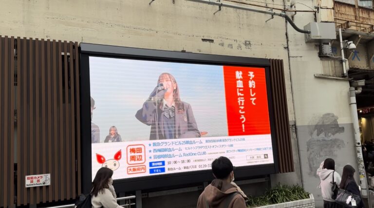 オリジナル献血啓発ソング「笑顔のバトン」のMVが梅田のHEP前で流れています!