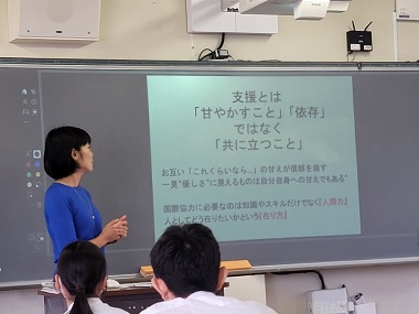 本校卒業生の山田美緒さん(在学時 山崎美緒さん)が、特別講師として本校に来られ、3年生の世界史演習βの授業で、ご自身の体験談などを講演していただきました。