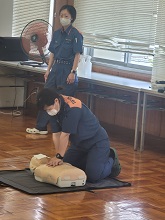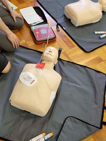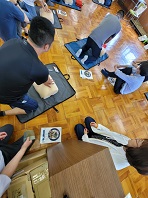 (倒れている人の)周囲の安全確認、倒れている人の反応(意識)の確認、呼吸の確認を行った後、必要があれば胸骨圧迫(心臓マッサージ)、この流れを一通り説明していただきました。