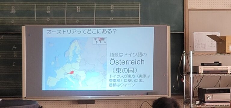 映画「サウンド・オブ・ミュージック」の劇中歌で知られる「エーデルワイス」には、ヒトラー率いるナチス・ドイツへの併合に抵抗するオーストリアの思いが込められていること。また、音楽一家であったトラップ家が、自分たちの思いをこの歌に託しながら愛する祖国を後にしたことなどが伝えられ、生徒たちは、当時この歌を歌った人の気持ちや、この歌が果たしてきた役割などを伺い知ることができました。
