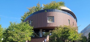 点呼の後、説明会の会場へと移動しました。大学にはおしゃれな建物もあります。