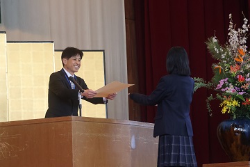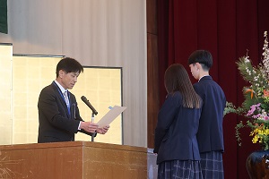 挨拶の後、ソフトテニス部と軽音楽部の表彰を行いました。