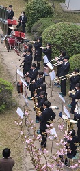 4月13日(月)昼休み、吹奏楽部による中庭コンサートが行われました。新入生の入学をお祝いする目的で、ここ数年この時期に開催しているイベントです。少し、気温は低めでしたが、まだ桜の花が残る中庭に、さわやかな音楽が響き渡りました。